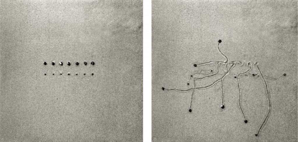 Daniel Ranalli crée des oeuvres en rapport avec la nature, dans cette série il place des escargots sur le sable d’une plage et les laisse se déplacer, laissant derrière eux des motifs composés de leur passage. Puis il photographie ces traces.